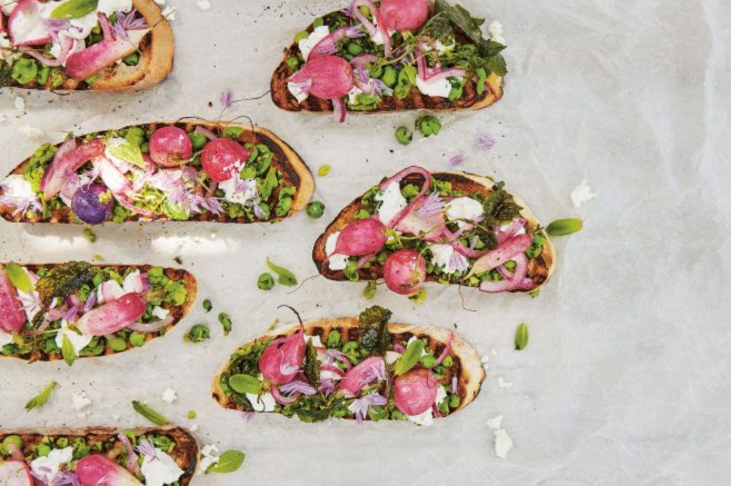 These little toasts are a riot of colour and represent all that is great about our gardens in spring. The first radishes, roasted until they sweeten, the sweet peas, and some allium or chive flowers, if you can get them, add some prettiness as well as a punch of flavour.