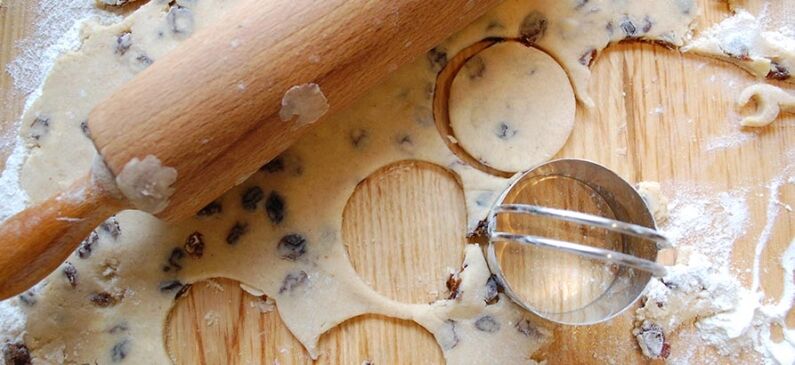 5. Rholiwch y toes allan ar arwyneb gwaith â blawd arno i drwch o 5mm a’u torri’n gylchoedd