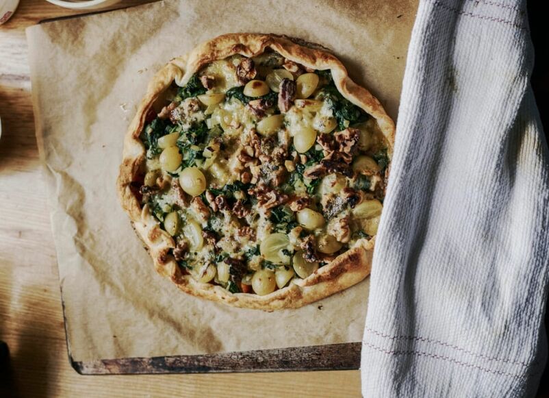 Rhowch y gymysgedd sbigoglys mwg dros corbwmpen, yna nythwch y grawnwin yn y sbigoglys a’r corbwmpwn. Briwsionwch y Stilton mewn darnau mawr a gwasgarwch y cnau Ffrengig a’r dail teim dros y cyfan.
