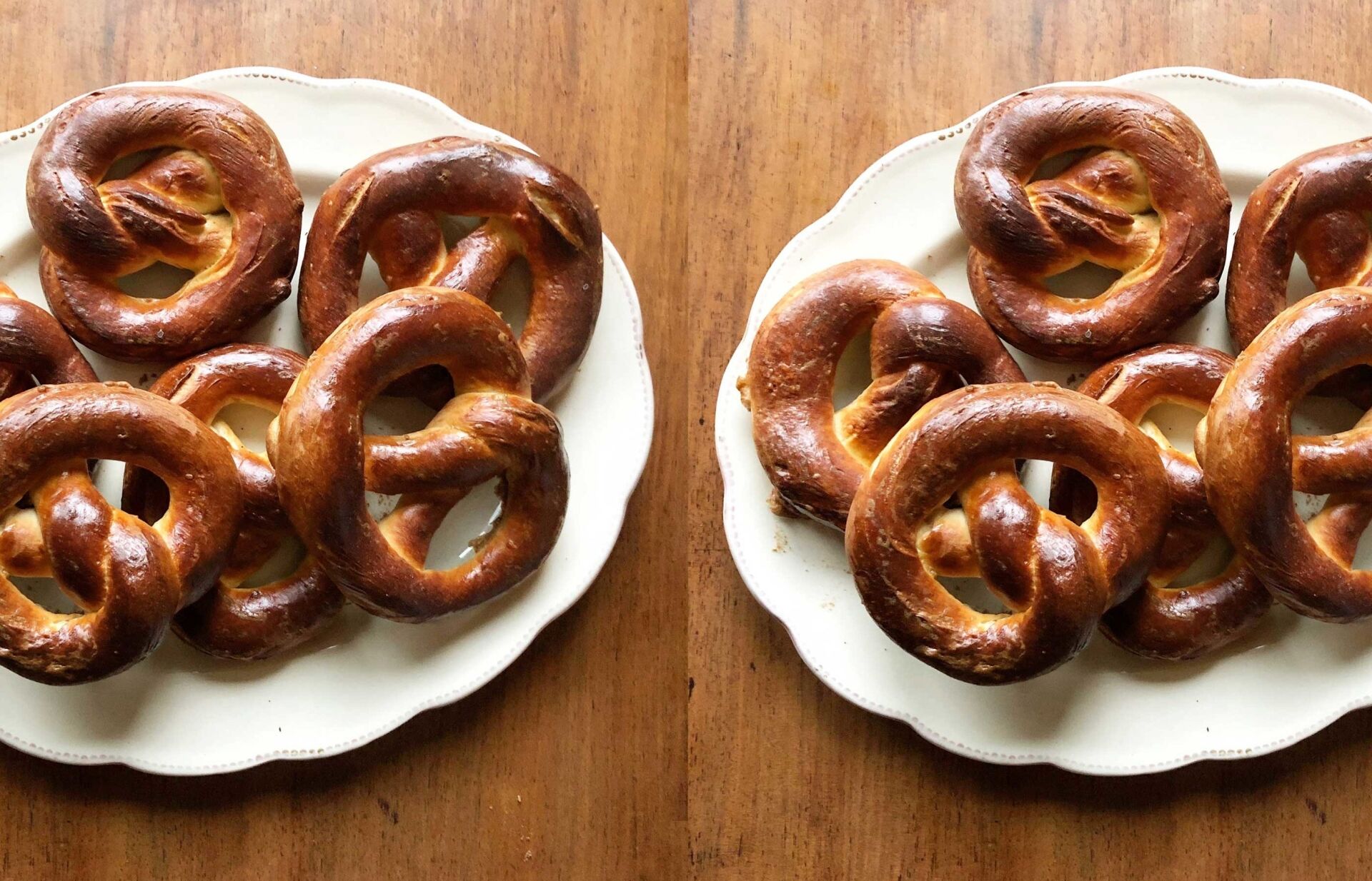 Rhowch yr hambyrddau wedi’u datgelu yn yr oergell am hanner awr er mwyn i’r pretsels ffurfio croen. Cynheswch y popty i 200°C.