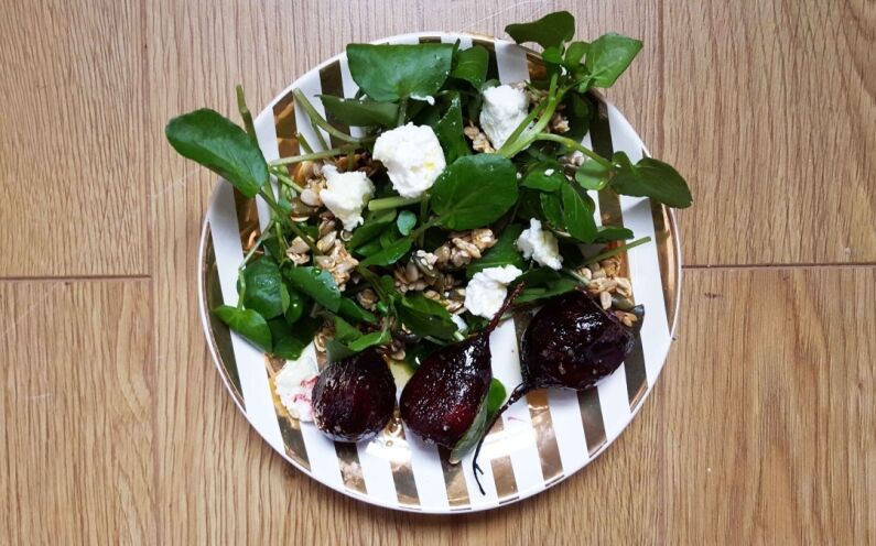 Rhowch y berw dwr mewn powlen fawr ac ychwanegwch lwyaid fach o gaws gafr. Ychwanegwch y betys a gorffen gyda’r granola, mintys, a mymryn da o olew olewydd.