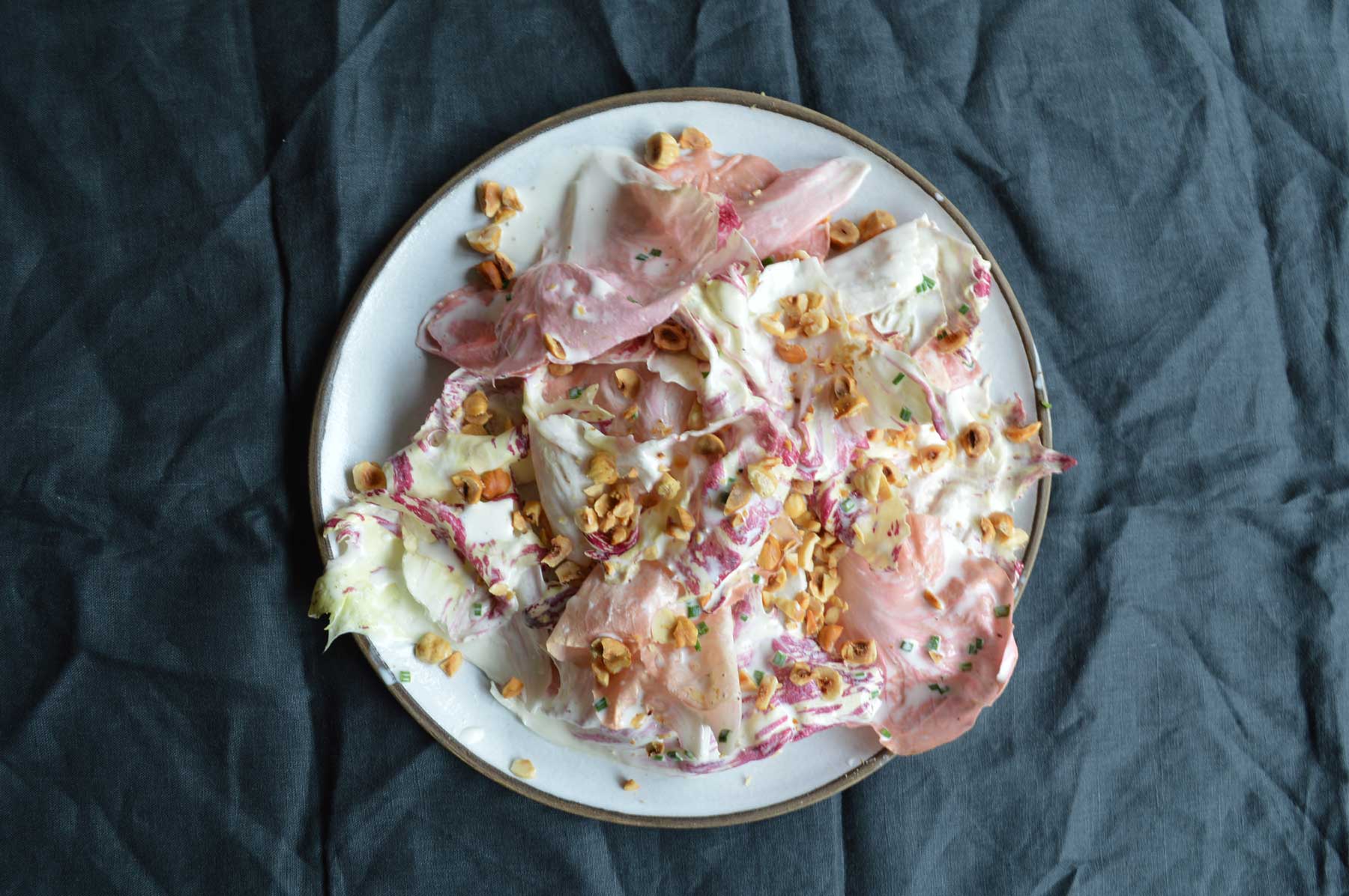 Gweinwch y salad hwn ar gyfer paletau gaeaf sydd wedi palu pan mae’r letys chwerw cain ar eu gorau. Ceisiwch gael hyd i letys castelfranco (yn y llun) os y gallwch – mae ganddo flas llai dwys na radicchio porffor. Ond bydd unrhyw letys chwerw yn gwneud y gwaith yn hyfryd.