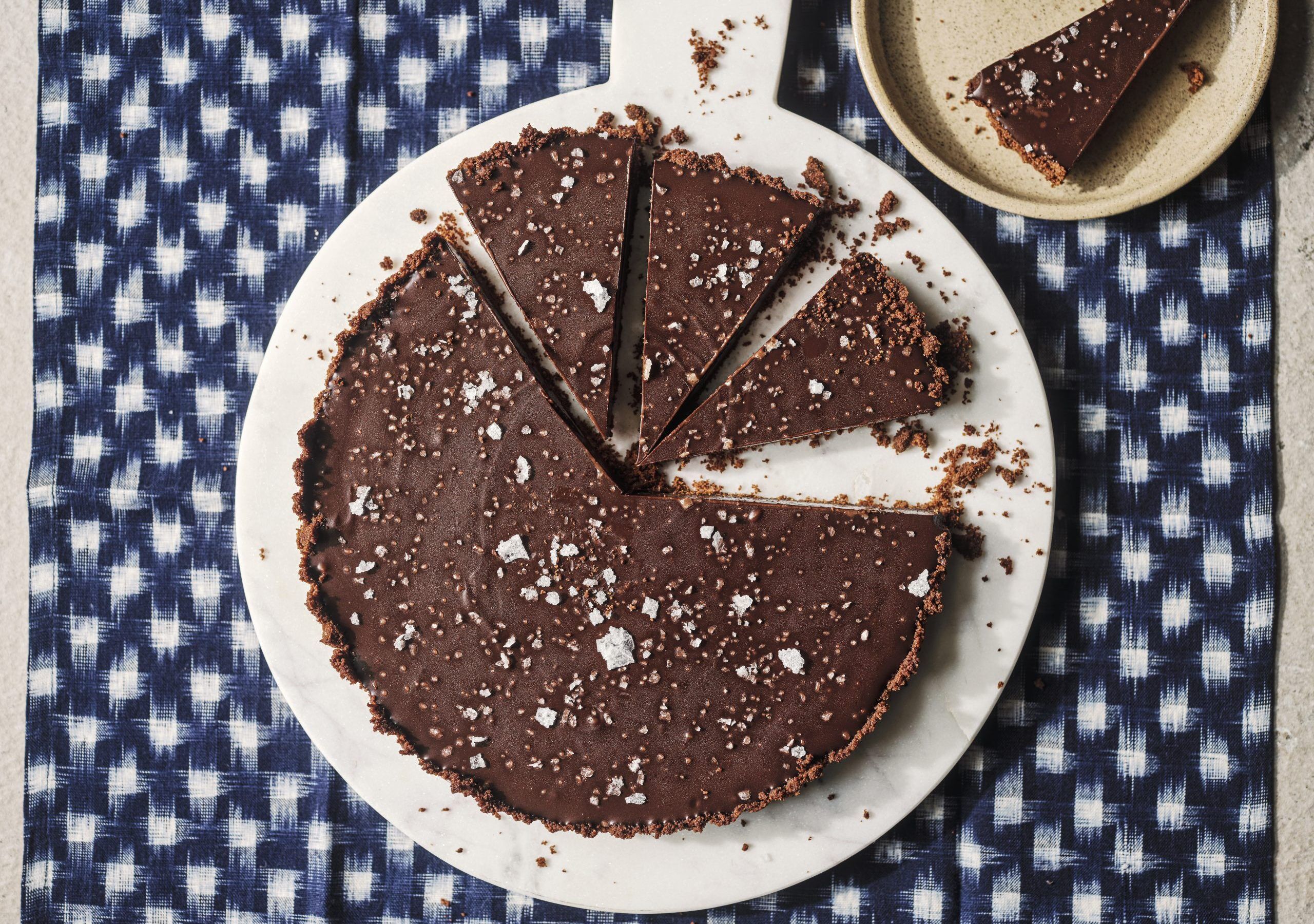 Remove the tart from the fridge and scatter over a generous pinch of flaked salt (any earlier and the salt will sink into the chocolate mixture). Chill for at least another hour, or up to 24 hours before slicing. Serve with crème fraîche and fresh berries. The tart will keep covered in the fridge for up to three days.