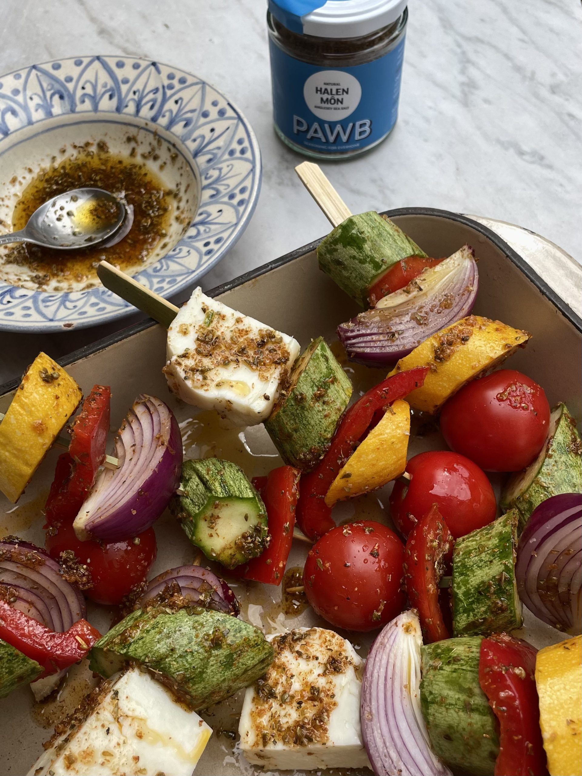 Pawb seasoning makes for a great marinade for the barbecue though these summery skewers would work well under the grill or in a griddle pan too. Make them with halloumi or chicken or simply with more vegetables. These skewers are made to be flexible, use what ever vegetables you have and are in season. They need a little time to marinate and refrigerate before you cook them so make sure to factor that in.
