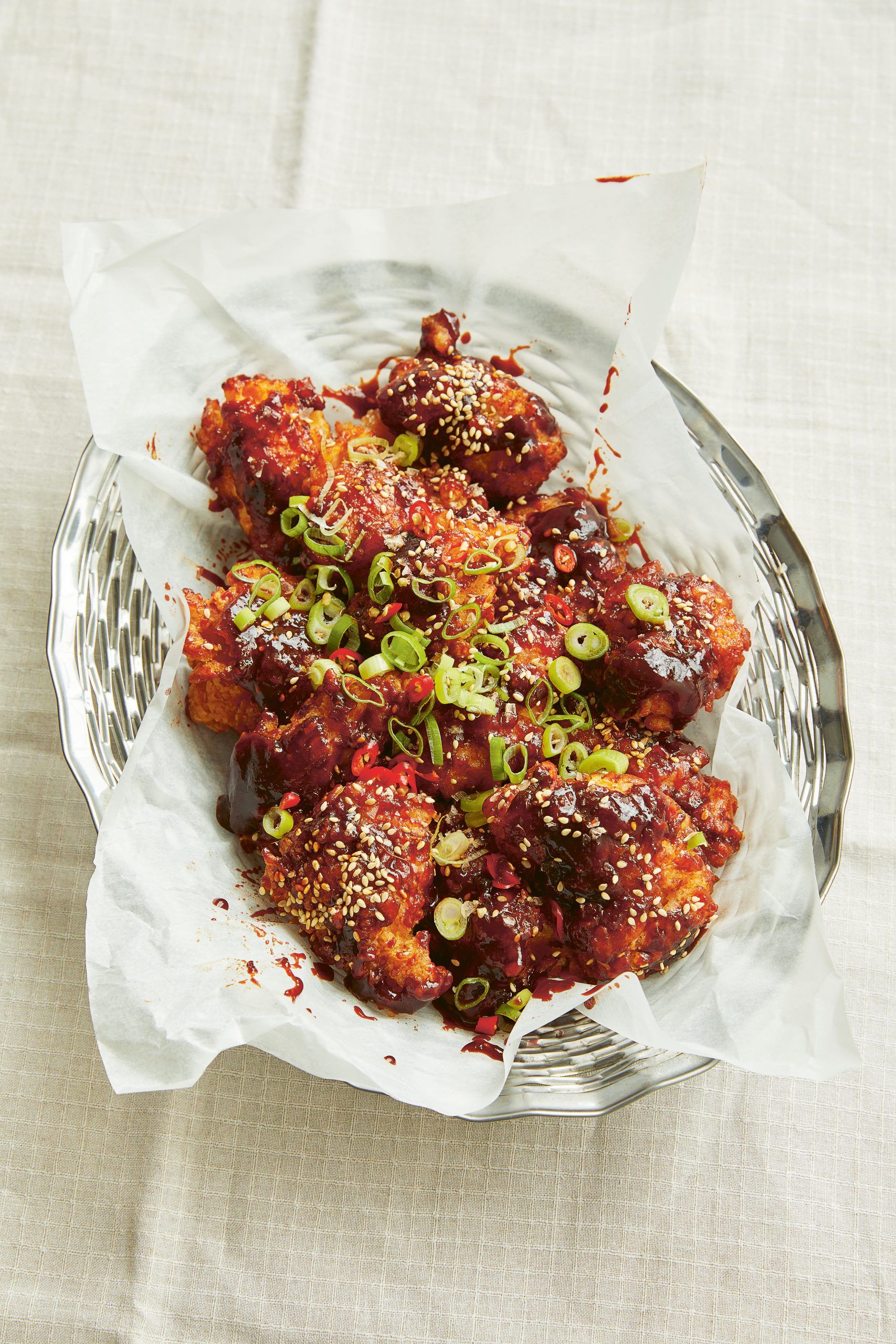 - Transfer to the lined baking sheet to drain off the excess oil. Repeat with the remaining chicken pieces. Toss the fried chicken in the gochujang sauce, then garnish with sesame seeds, spring onions and red chillies, if you like. Enjoy.