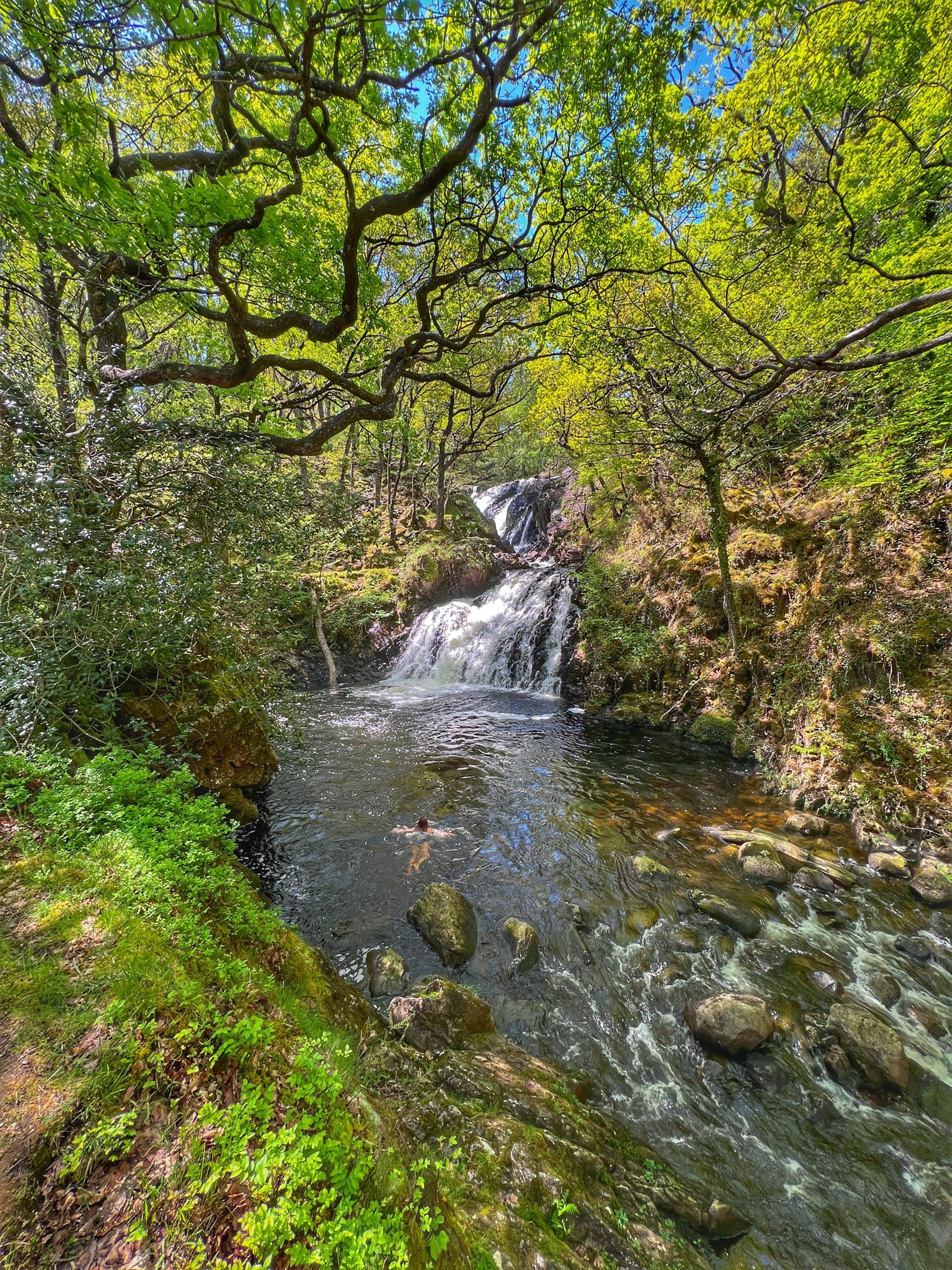 At Ganllwyd, we walk upstream, alongside the cascading Afon Gamlan, through groves of ancient woodland, to reach the mighty Rhaeadr Ddu (Black Waterfall). This broad, multi-stranded waterfall sparkles under a canopy of oak. A careful scramble down over rock brings you to a magnificent, large plunge pool. The twisted branches of the ancient trees and their mantle of green are captivating as you float in the black velvety water.