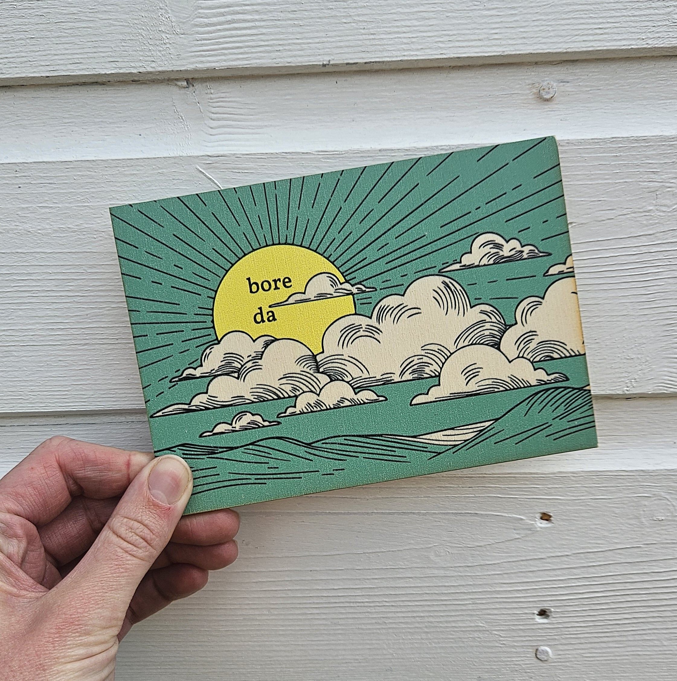 Bore Da = Good Morning. These wooden postcards, designed by Jess Lea-Wilson, are made to keep.