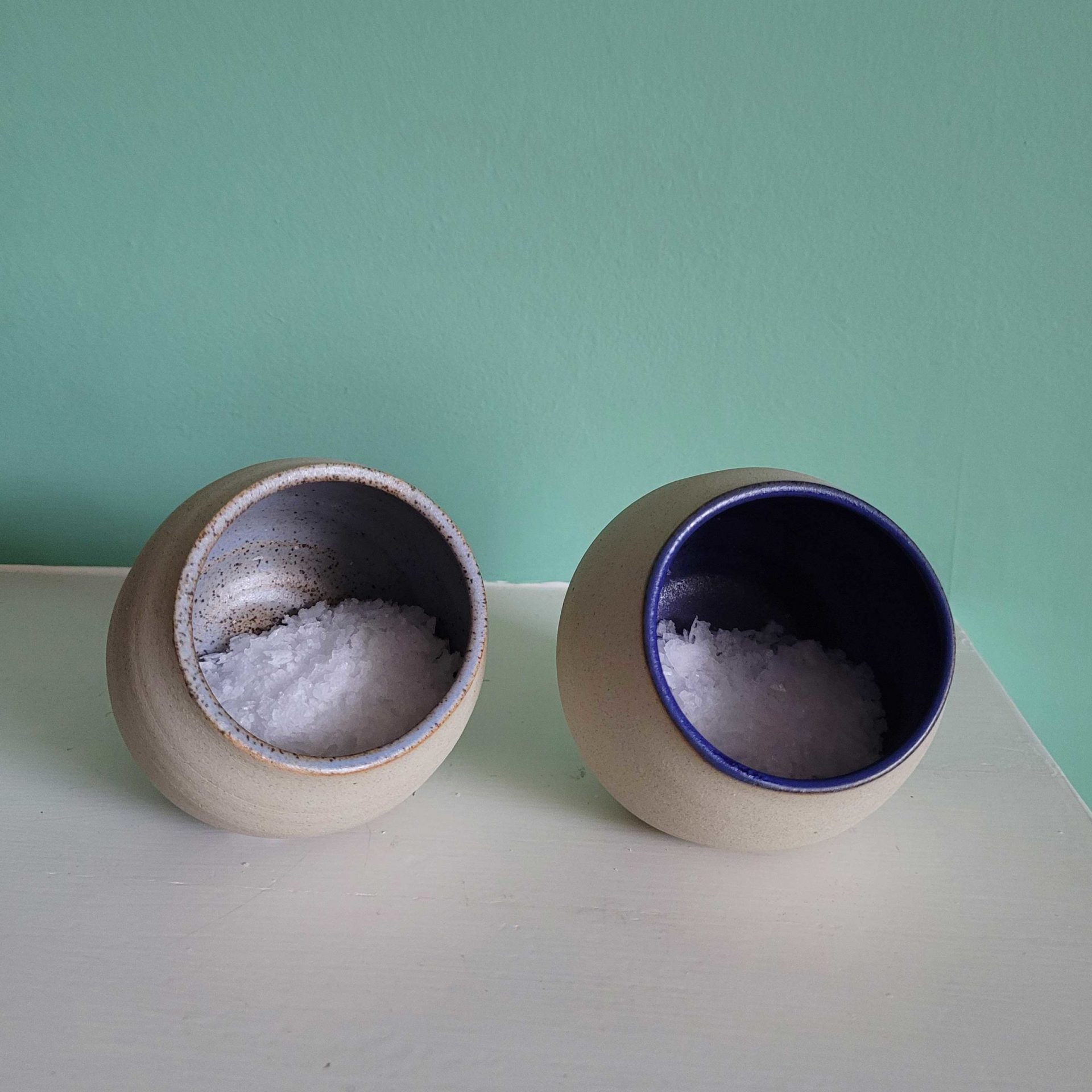 Each piece is hand-thrown on the potter's wheel and trimmed with a rounded base. When the pots are still damp they are pushed at an angle onto the surface so that each salt pig will sit either with a tilt or upright making it perfect to hold the salt but also scoop it out easily.