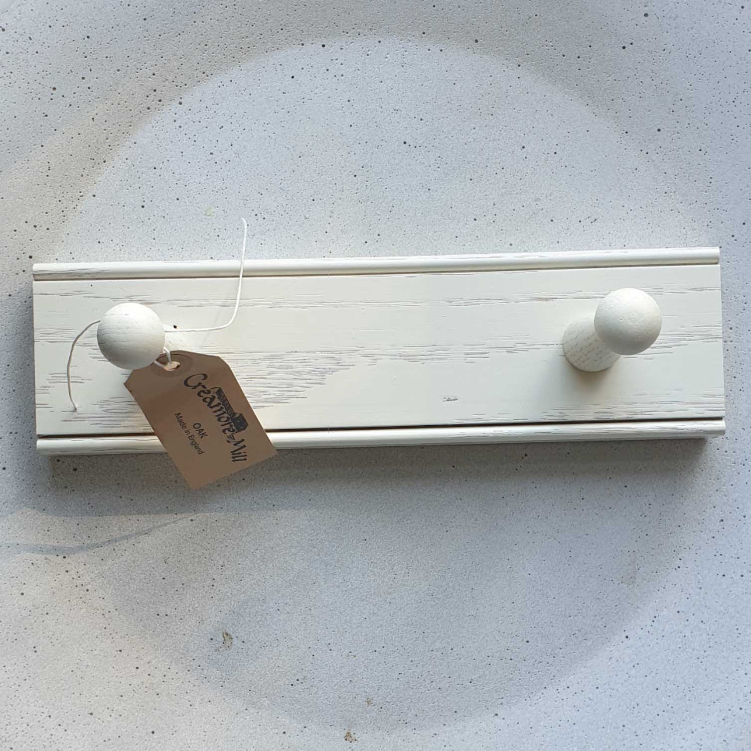 A beautifully crafted oak peg rail perfect for coats and jackets, or storage of any household essentials. 2 pegs on a solid piece of painted off-white oak with a beaded detail top and bottom and concealed keyhole fixings at the rear.