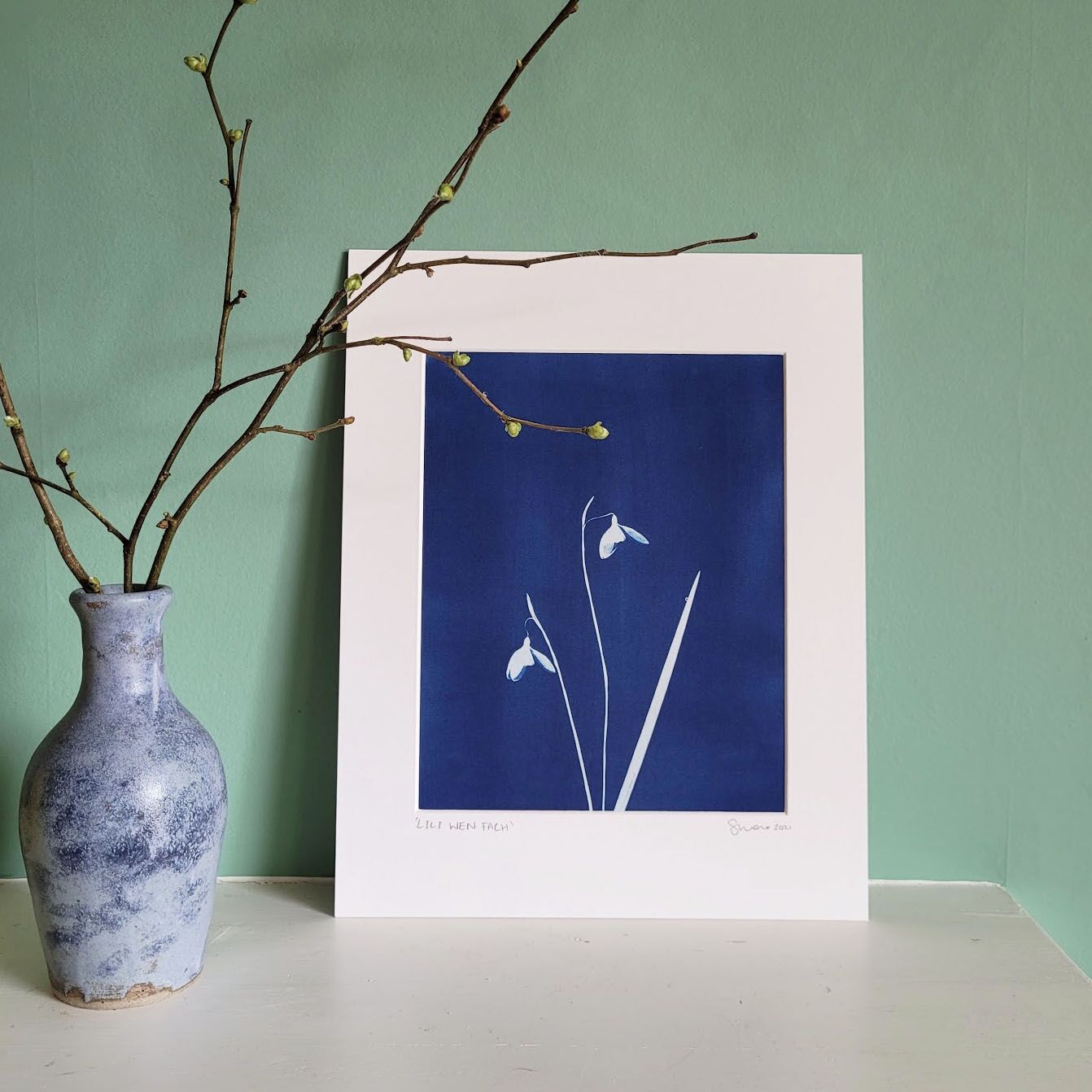 A one of a kind Cyanotype print of a beautiful snowdrop, mounted and ready to frame. Created with local Welsh plants and flower specimens.