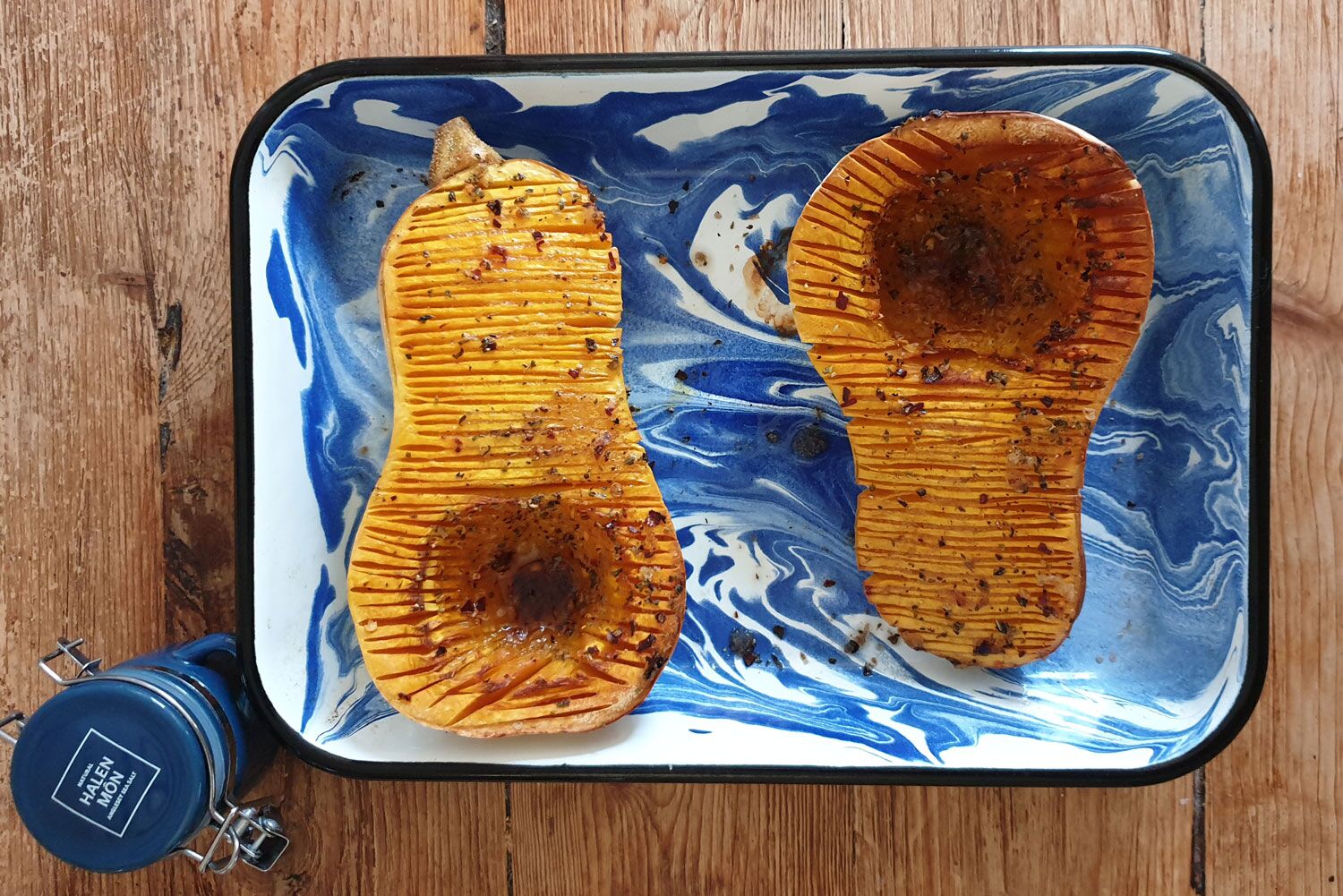 Peel and very thinly slice a butternut squash (don’t put your knife all the way through)
