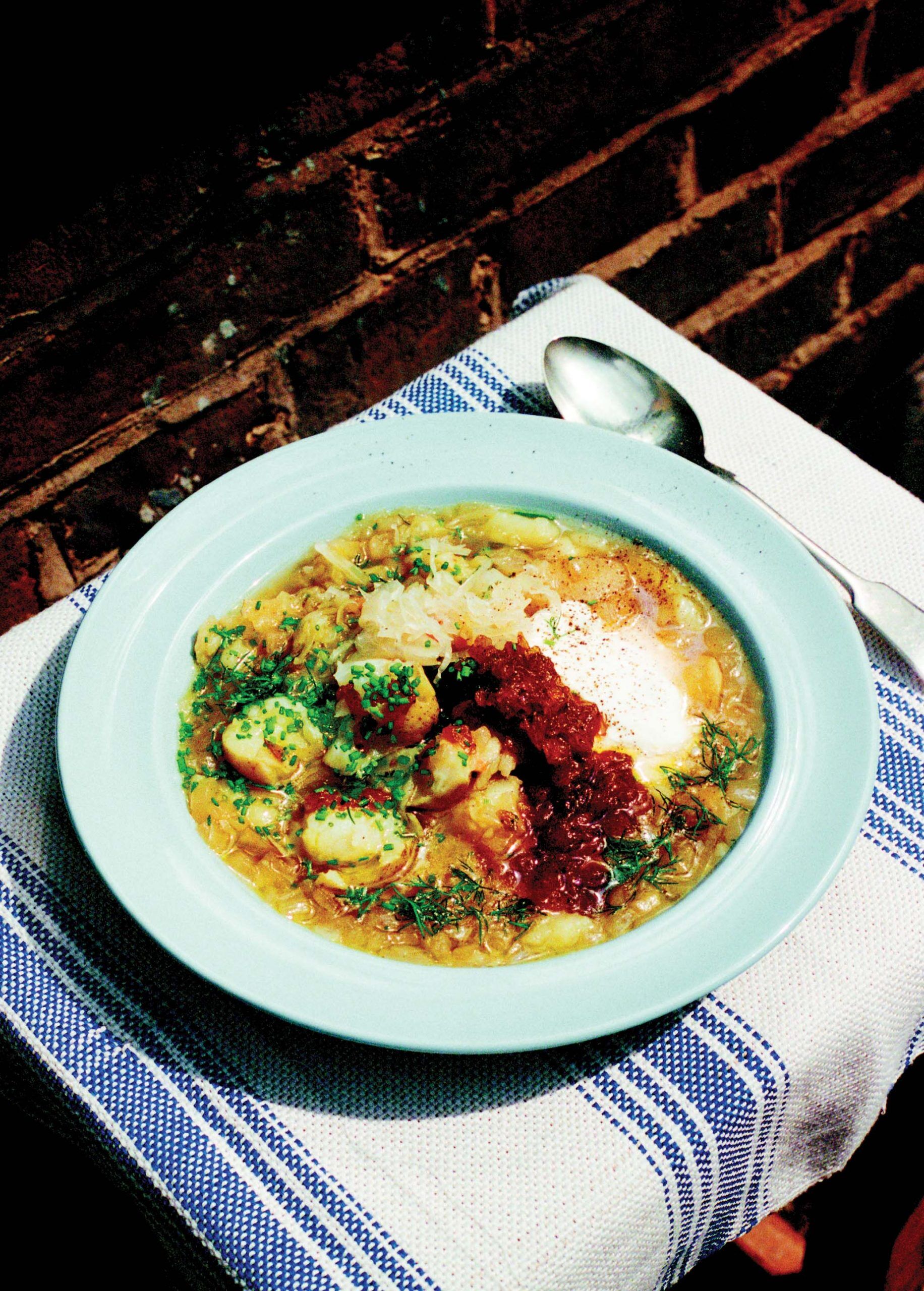 8. Serve in bowls, topped with a dollop of sour cream, a sprinkle of chives, the rest of the sauerkraut, the reserved caramelised onions and more black pepper.