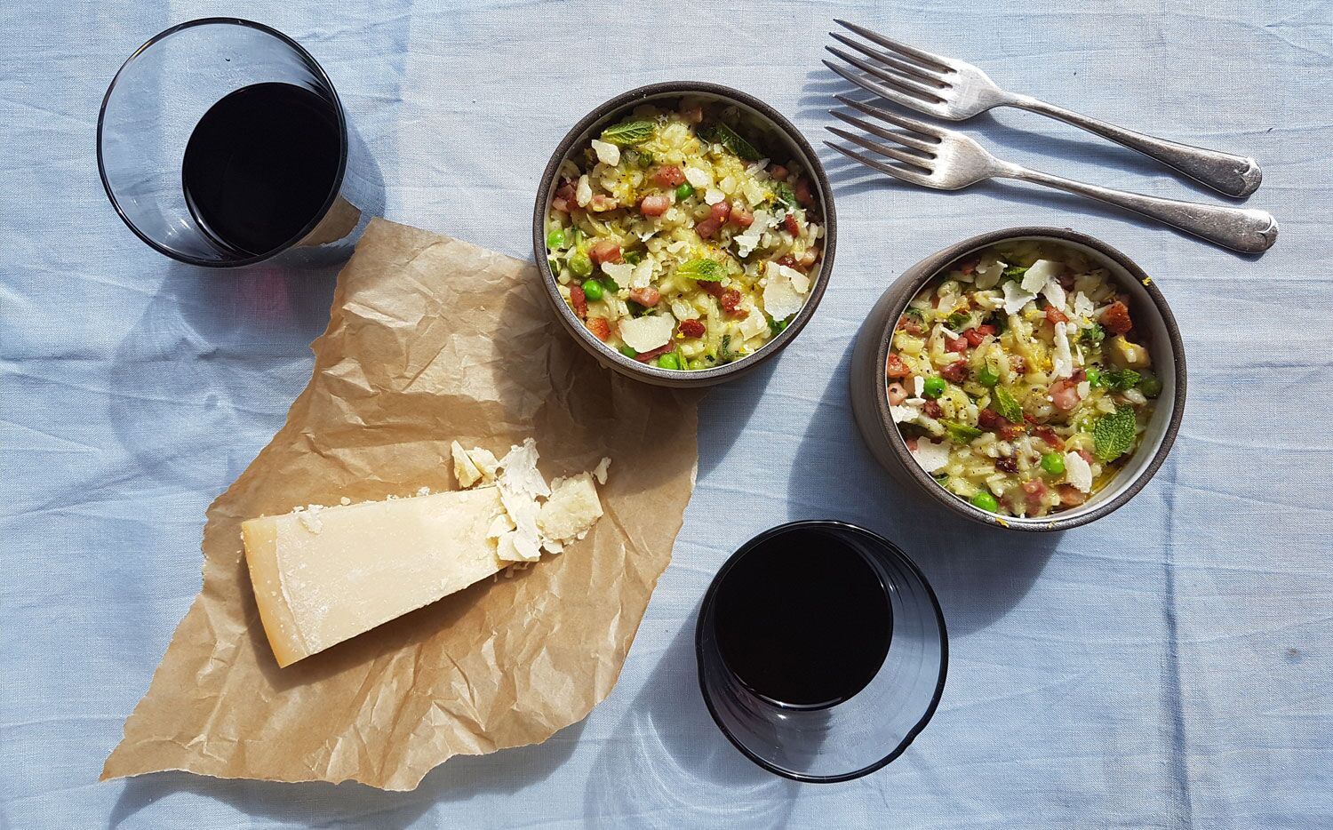 Next, add the stock, a ladle at a time, and continue add, stir, and let the rice absorb the liquid for 20 minutes, until the rice has increased in size, but still has a ‘bite’. Stir in the peas and mustard and take the pan off the heat and leave to sit for 5 minutes to rest.