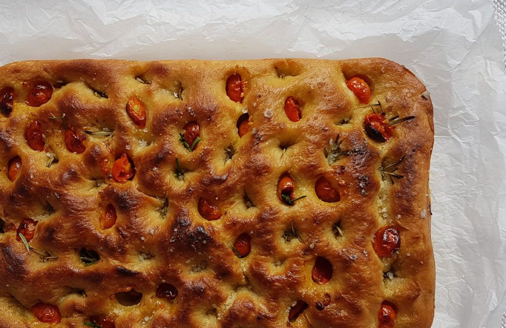 Place the focaccia in the centre of the hot oven for 10 minutes, then turn the heat down to 200C and cook for a further ten minutes. Take the focaccia out of the oven and drizzle more olive oil over. Allow to cool for 10 minutes before slicing into squares in the tin.