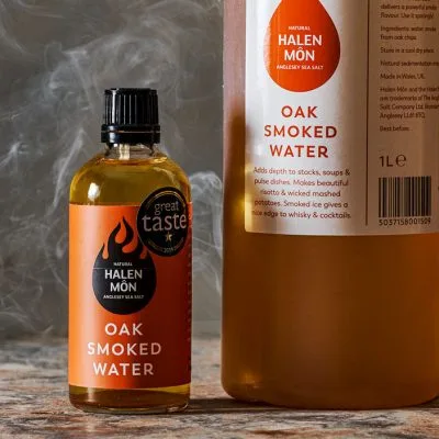 Our Smoked Water is a 100% natural artisan ingredient, made entirely from wood smoke and water. It has a huge range of culinary applications for homecooks and professionals alike. Our skilled team makes the product in our artisan smokers on-site at Halen Môn in Wales, using sustainable hickory and oak chips.